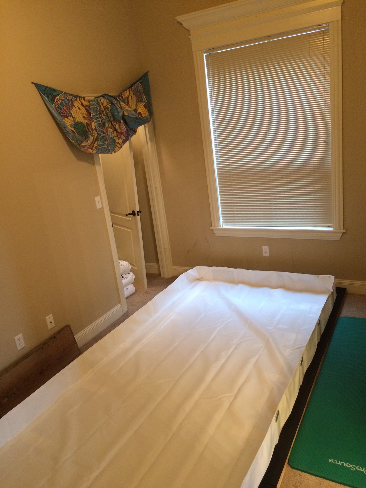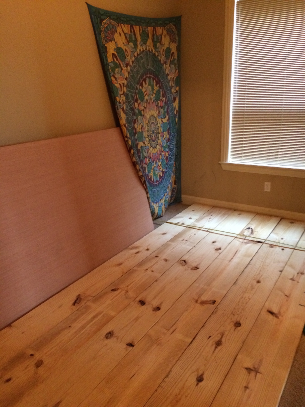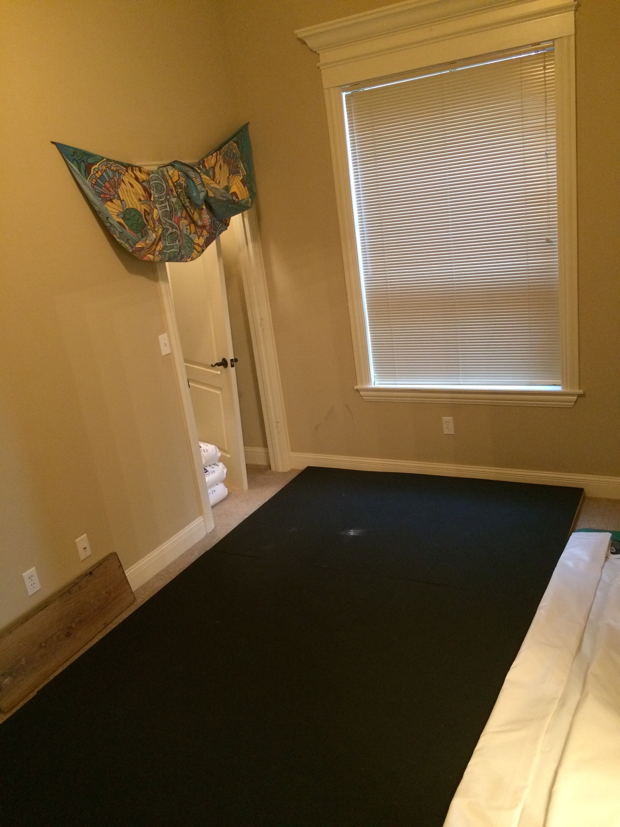 The process started with the base which consisted of six 12”x2” pieces of wood from Lowe’s. This would help with absorbing some sound and distribute the weight across the floor. On top of the wood platform there is a thin piece of plywood to make a smooth surface. On top of the plywood are three 6’x4’ pieces of sound absorbing rubber purchased from Acoustical Surfaces. This is to ensure that the tent is completely soundproof especially from vibrations traveling through the floor. The main sounds that seem to travel into the tank are vibrational such as door slams and people walking. When the base was complete it covered 12 feet by 6 feet which fits perfectly in the room (even allowing space for a yoga mat).