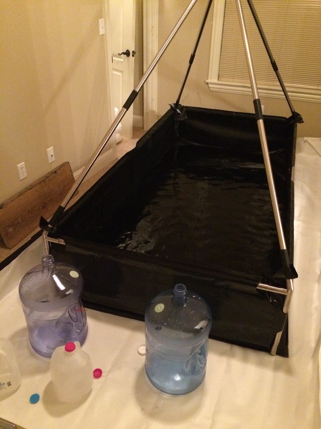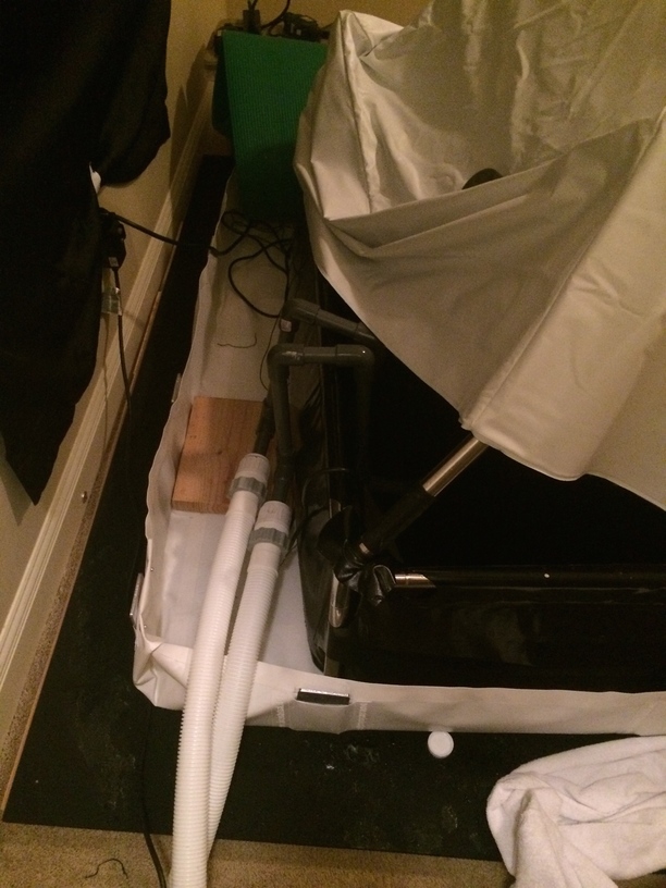 Then the spill berm was setup on top of this platform. The spill berm was designed for industrial spills including harmful chemical spills. This seemed to be the perfect device to catch any excess water or if the tent leaked. I had a white (epsom salt is harder to see on white) custom made spill berm that was 11’x5’ that will ensure plenty of space for the 8’x4’ tent. Also having this much space allowed me to make the tent go across the wood beams diagonally to keep the weight distributed across multiple beams (5-6 beams instead of 4).