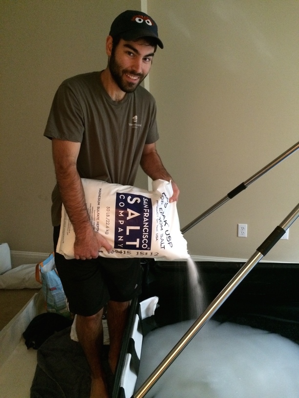Finally it was time for the Epsom salt which I purchased from Sf Salt Co. They have really good prices on bulk Epsom salt and they also were at the Float Conference this year. I ended up purchasing 1,100 lbs from them which arrived on a pallet in individual 50lb bags. As of this blog post I have around 635lbs of Epsom salt and about 115 gallons of water in the tent.